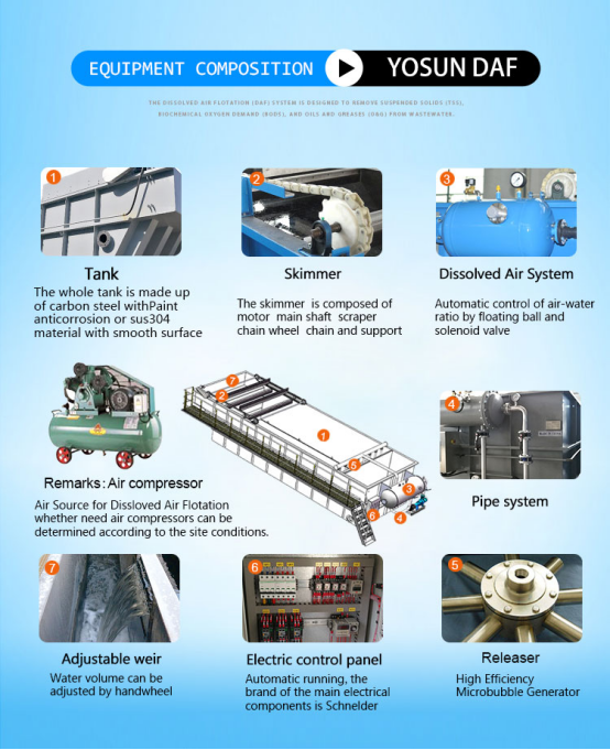 Dissolved air flotation is composed of DAF tank , air dissolving system , dissolved air return pipeline , dissolved air water release device , skimming system and electric control cabinet.
